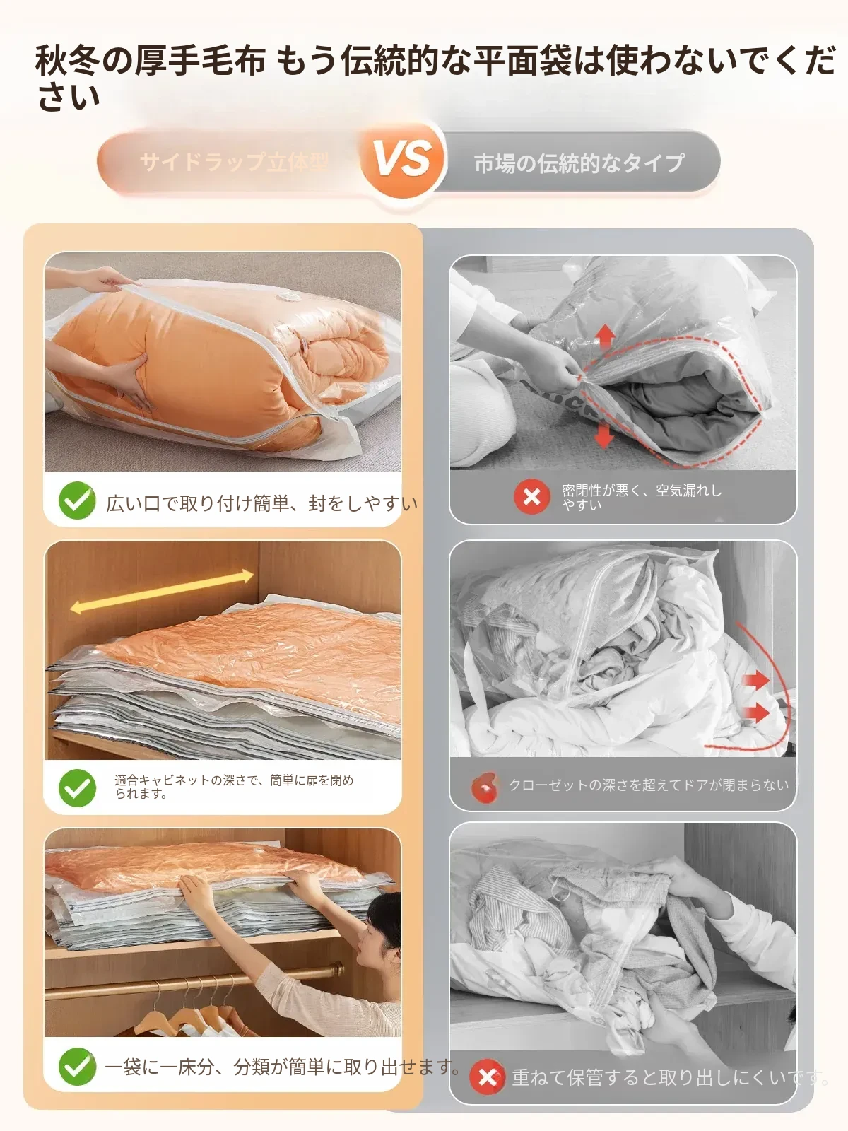 衣類・羽毛布団専用!驚きの真空圧縮袋で収納力アップ!衣服や布団をコンパクトに整理整頓、スペースを有効活用する家庭の必需品!