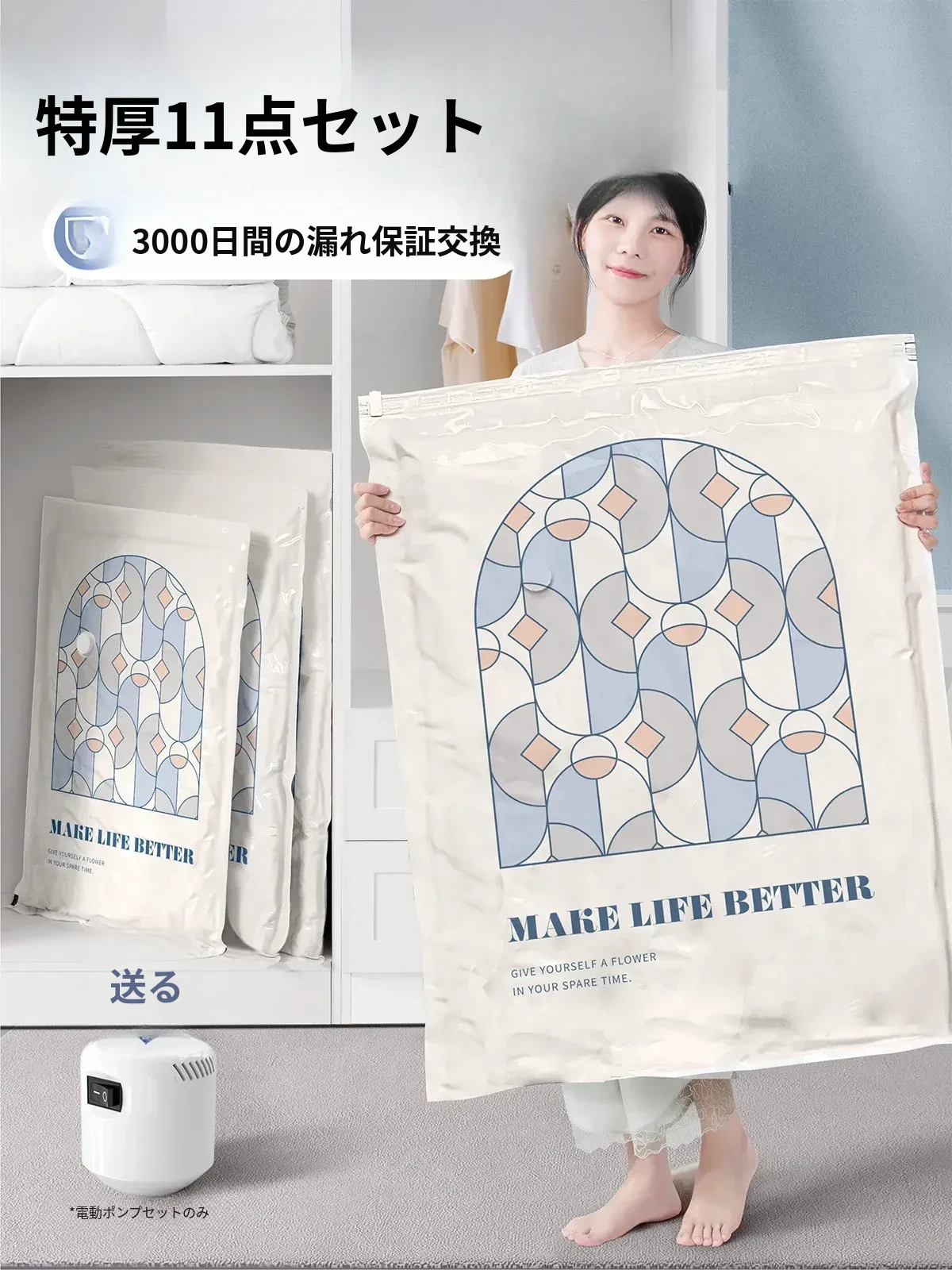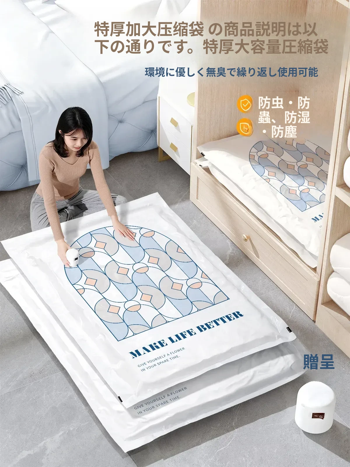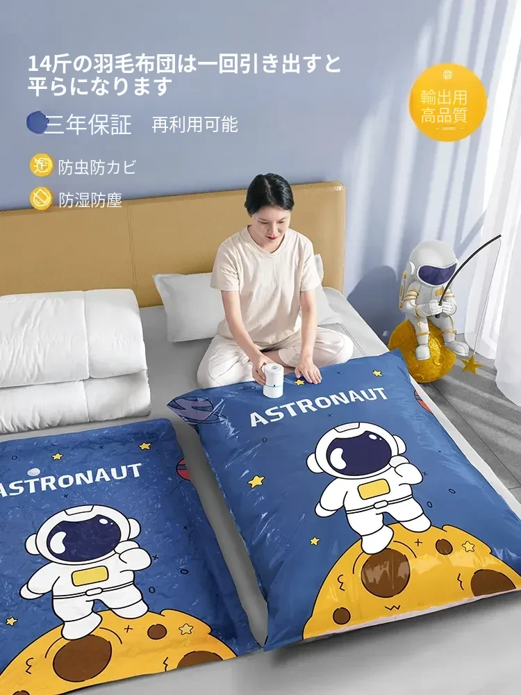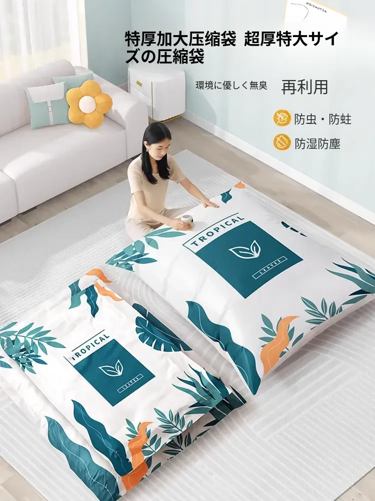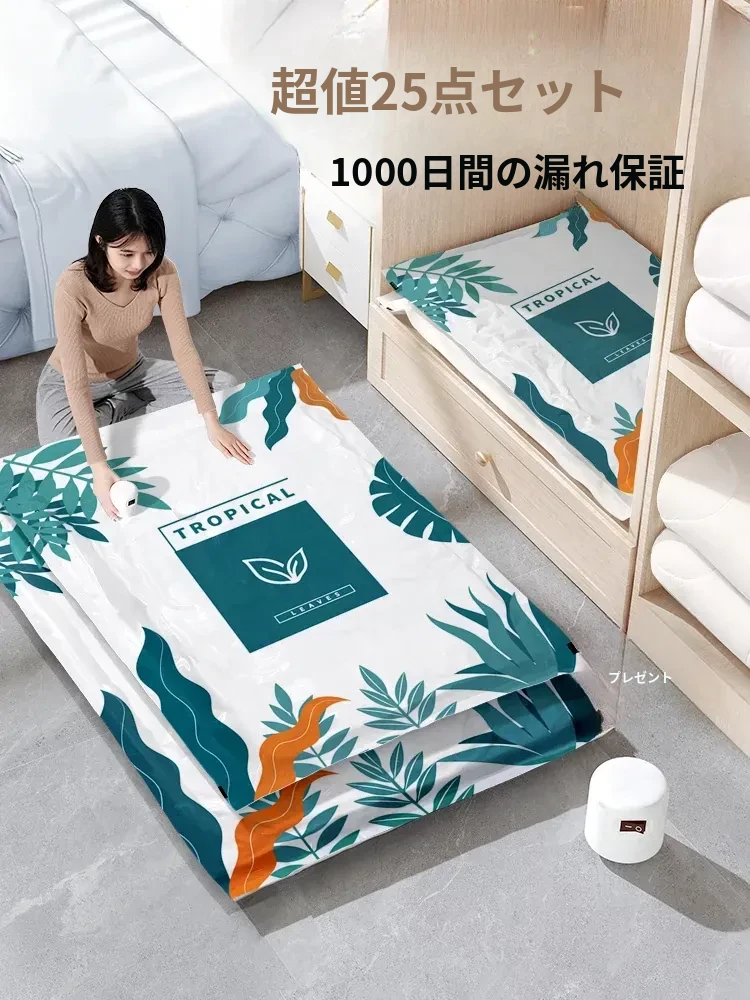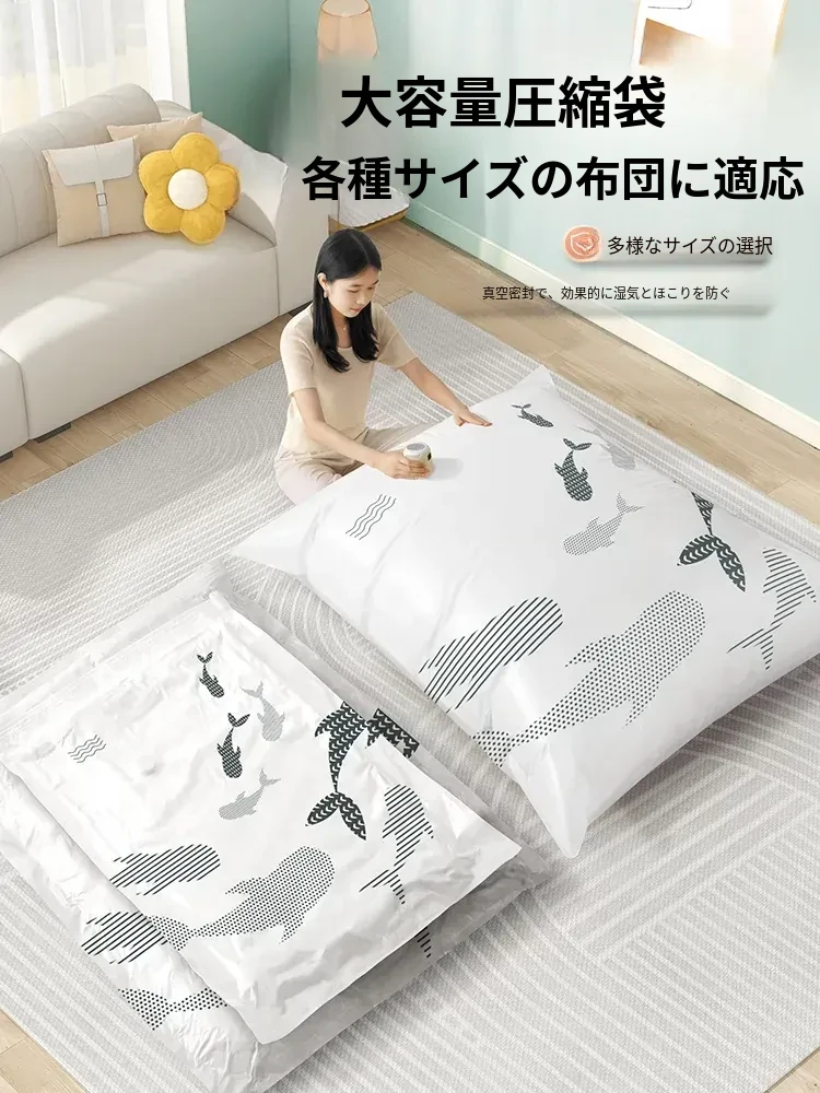 衣類・布団専用の厚手真空圧縮袋|電動で簡単にコンパクト収納!家庭用の便利なアイテムで、衣服や布団をスッキリ整理。省スペースで収納力抜群、湿気やホコリから守ります!