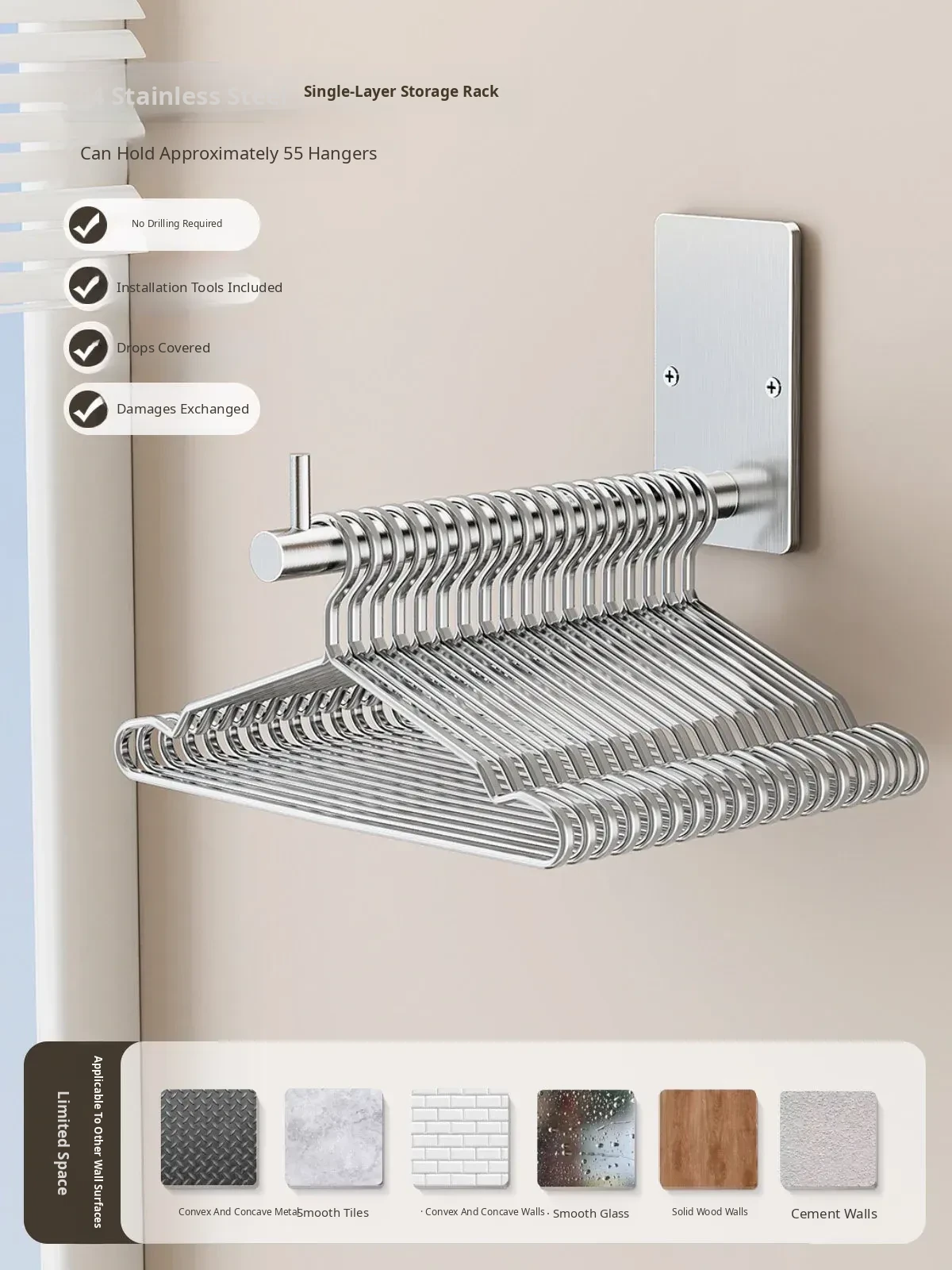 Stainless Steel Wall-Mounted Clothes Drying Rack - No Drilling Needed, Perfect for Balcony Organization and Storage, Made of Durable 304 Stainless Steel